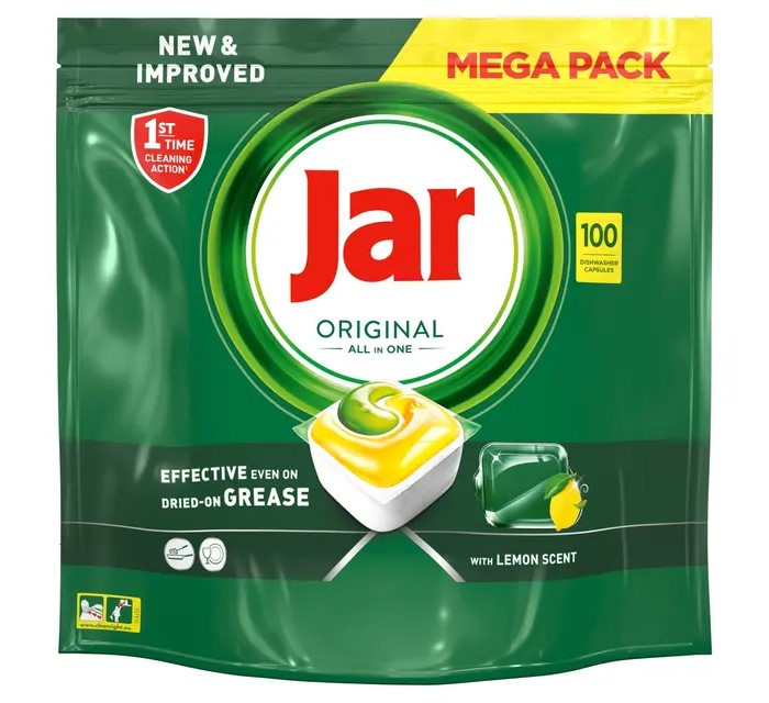 A Jar Original all-in-one mosogatókapszula már az első mosogatás alkalmával hatékonyan elbánik még a rászáradt zsíros szennyeződésekkel is, és ragyogóan tiszta edényeket hagy maga után. A Jar egyetlen kapszulában ötvözi a folyékony és a por állagú mosogatószerek erejét. A rendkívül gyorsan oldódó párnácska szinte azonnal kifejti tisztító hatását, így hatékonyan elvégzi a munkát. Ráadásul rendkívül egyszerűen használható! Kicsomagolnia sem kell, csak helyezze a kapszulát a mosogatógép mosogatószer-adagolójába.